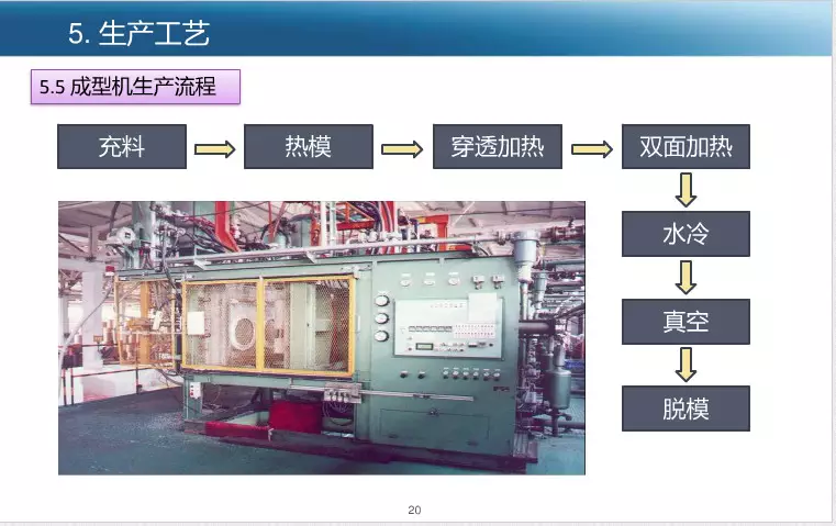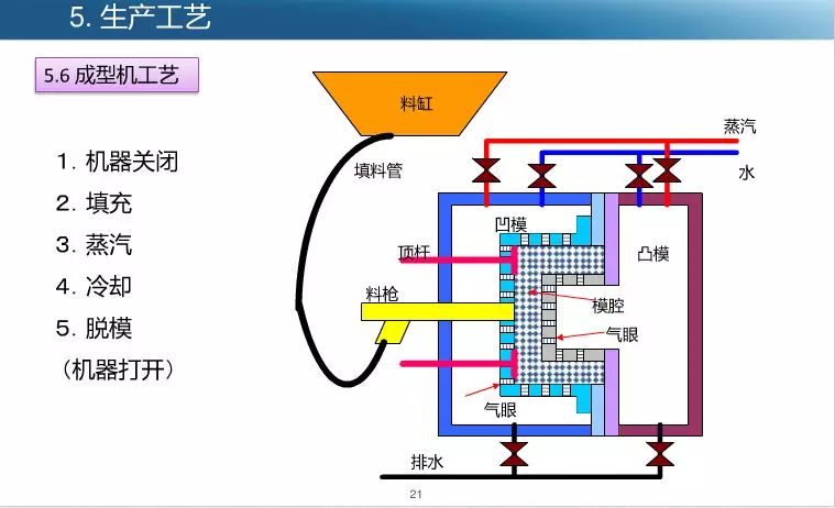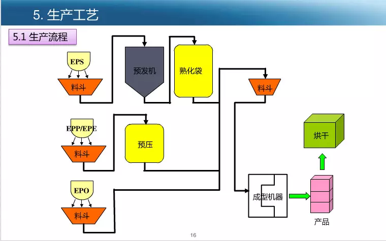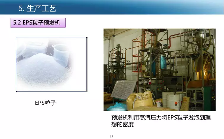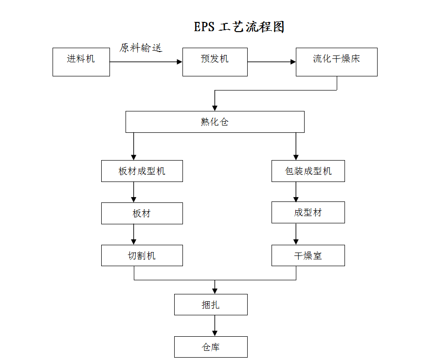 EPS制品成型工艺,涉及原料、预发机理、管道工艺及系统匹配工艺。主要以水、蒸汽、空气为介质,经过预发、熟化、成型、烘干和切割等物理原理工序制成。